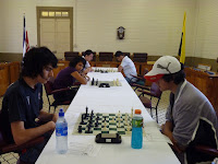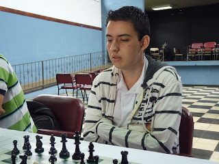 quisieron experimentar en la posición y acaban con un tablas. La siguiente partida fue la de Erick Blando y Joan Ramírez, jugaron una partida bastante interesante Erick conduciendo las piezas negras comete una impresición y queda cierta desventaja, sin embargo al llegar a la posición de las emociones en donde para el aficionado empieza la partida y el blanco mantiene una cierta superioridad, simplemente se limitaron a estrecharse la mano y dividir el botín. Mientras tanto la partida de Juan José y Jimmy sólo tuvo una cara, el naranjeño cometió una serie de errores de apertura y el santaneño